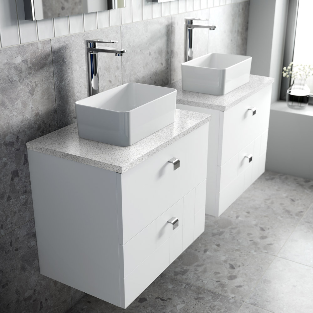 Features & Benefits: DISCON - Nuie Blocks 600mm 2-Drawer Wall Hung Satin White Vanity Unit & Sparkling White Worktop