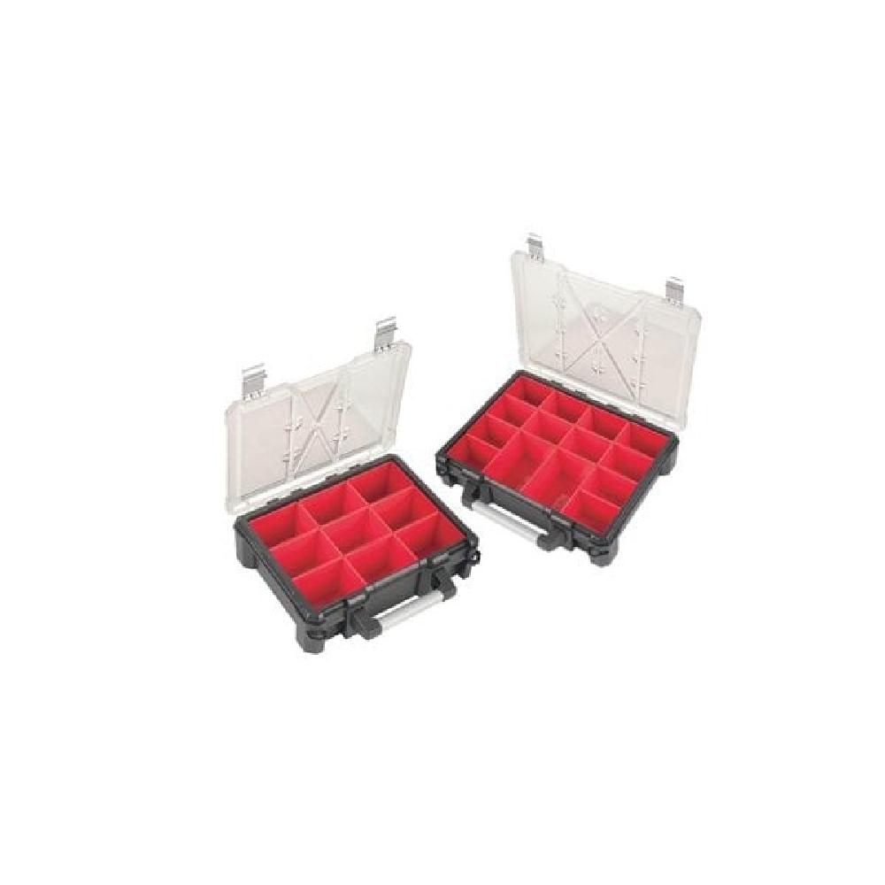 This black and red hard plastic chunky SORTA-CASE is medium in size. It includes nine removable compartments and is 380 x 355 x 110mm in dimension, as well as 1.75kg in weight.