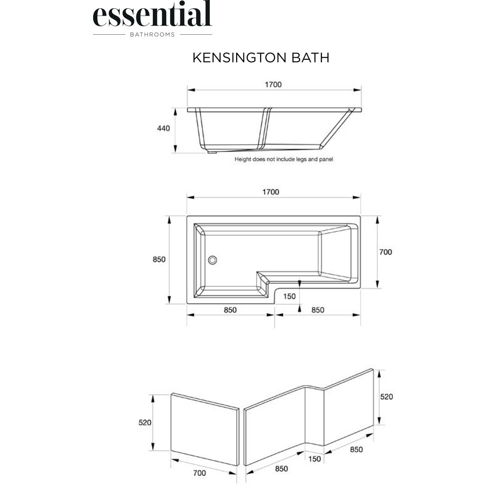 Features & Benefits: DISCON-Essential Kensington 1700mm x 850mm L Shape Left Handed Shower Bath Pack With Bath Front Panel & Matt Black Bath Screen