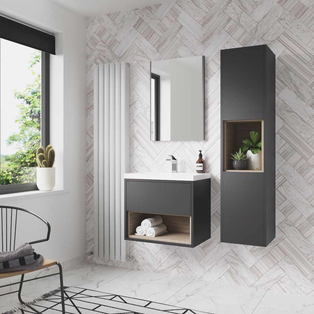 This classy, wall-hung Grey Gloss ceramic mid-edge basin unit from Hudson Reed will give your bathroom the makeover it desperately needs. Complete with a driftwood open shelf for a stunning contrast, it's stylish yet extremely functional. And as it comes with several size options, you'll definitely find the right one for your bathroom.