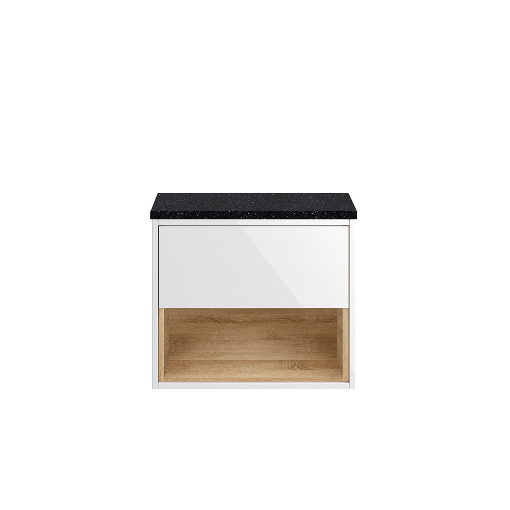 The wall hung drawer units and worktops by Hudson Reed are a stylish storage solution and can be used for a vast range of modern bathroom designs. Each unit is supplied with a rigid construction type. As well as a laminate worktop which can combine nicely with a vessel basin. Once the drawer unit is in place via easy installation, you can benefit from a unit manufactured to a high quality. This includes the beautiful contrasting design of the gloss white unit with a natural oak open shelf that can also be colour coordinated with a gloss W.C. unit if desired.