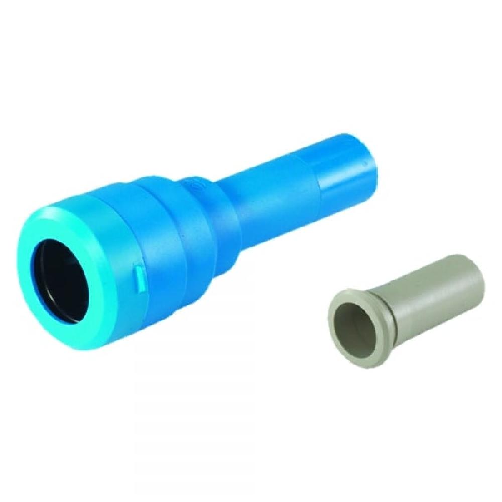 This imperial converter is supplied with an inch-sized pipe insert. It is used to convert metric size fittings for use with imperial sizes LDPE to BS1972 Class C. The stem cannot be disconnected from the mating connector with a collet cover fitted.
