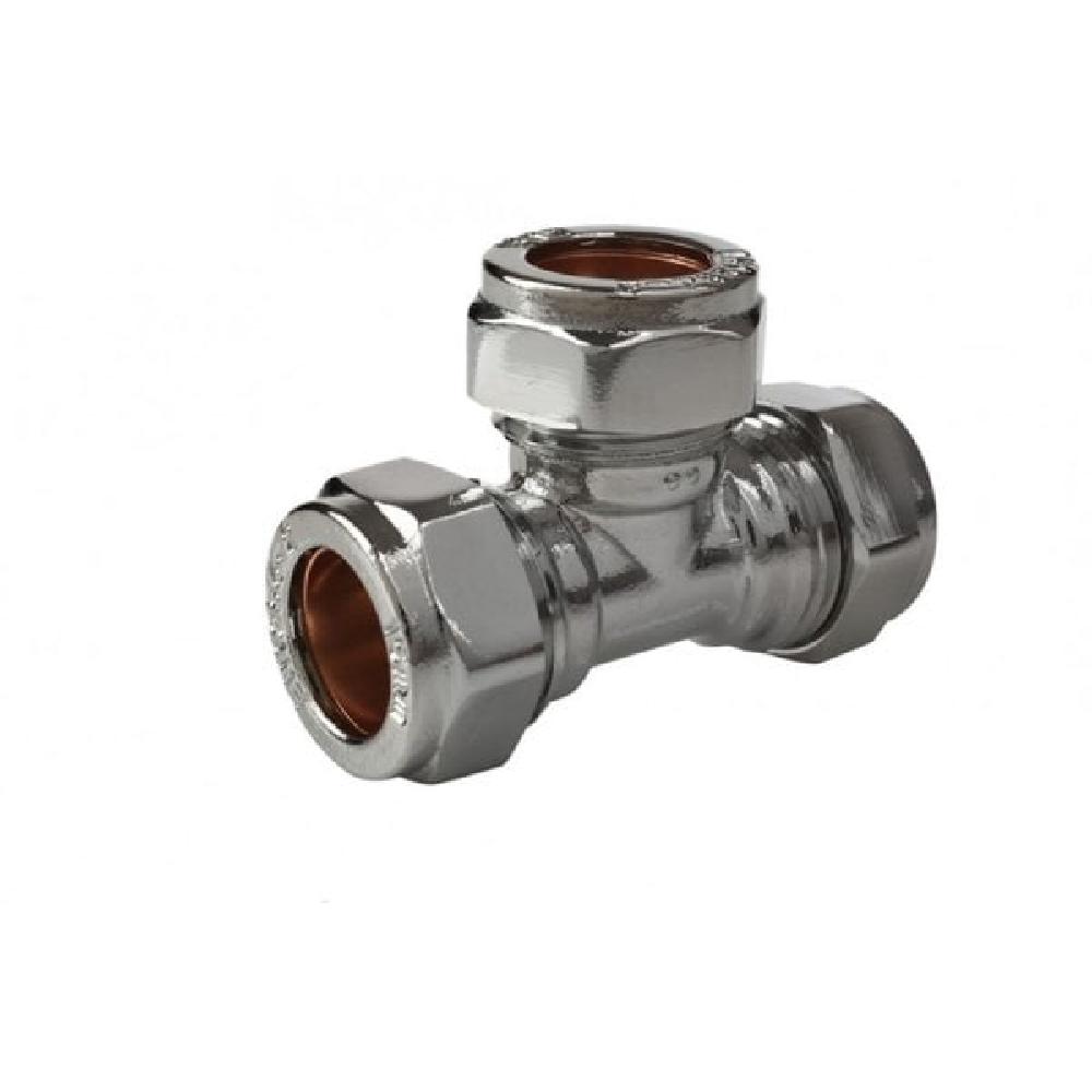 This equal tee with compression ends is chrome plated and is suitable for use on hot and cold water services such as heating installations in domestic applications. It is available in a range of sizes.