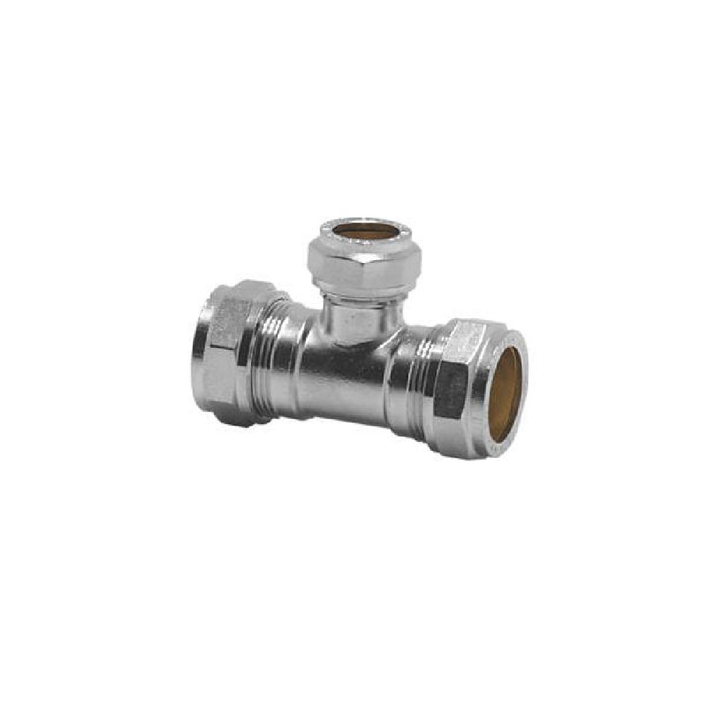 This chrome plated reducing tee with compression ends is suitable for use on hot and cold water services such as heating installations in domestic applications and is available in a range of sizes.