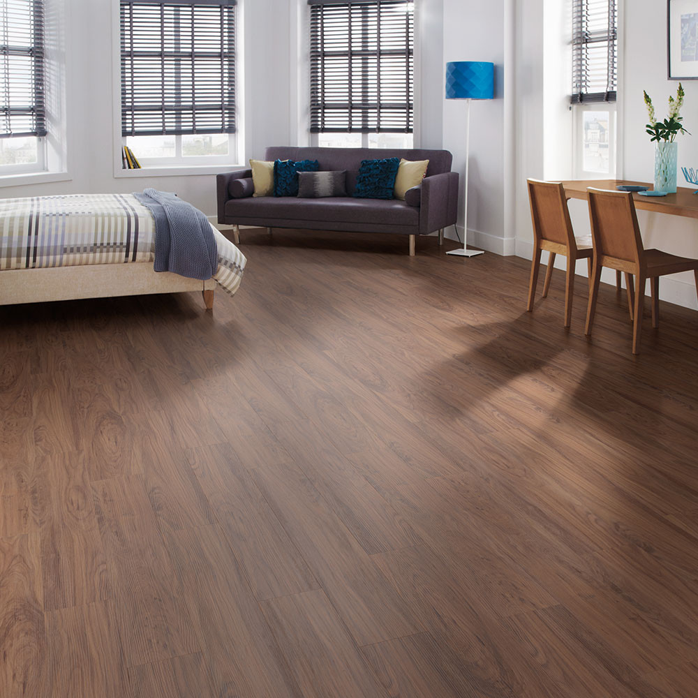 Inspired by natural walnut timber flooring, Palio Trade by Karndean's Palio Core Asciano LVT features a rich, mid-brown finish with an array of authentic woodgrain designs. Its dramatic appearance will create a stunning contrast to well-lit rooms with muted colour schemes.
