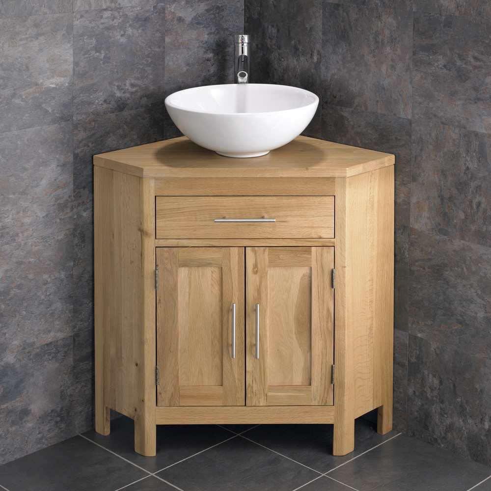 Made from durable natural oak, this charming corner cabinet provides plenty of storage space to help you maintain a spotlessly clean area. Besides its shelved storage space hidden away behind double cabinet doors, the unit's large flat surface provides plenty of room for a counter-mounted basin, as well as room for your hand soap and other toiletries.