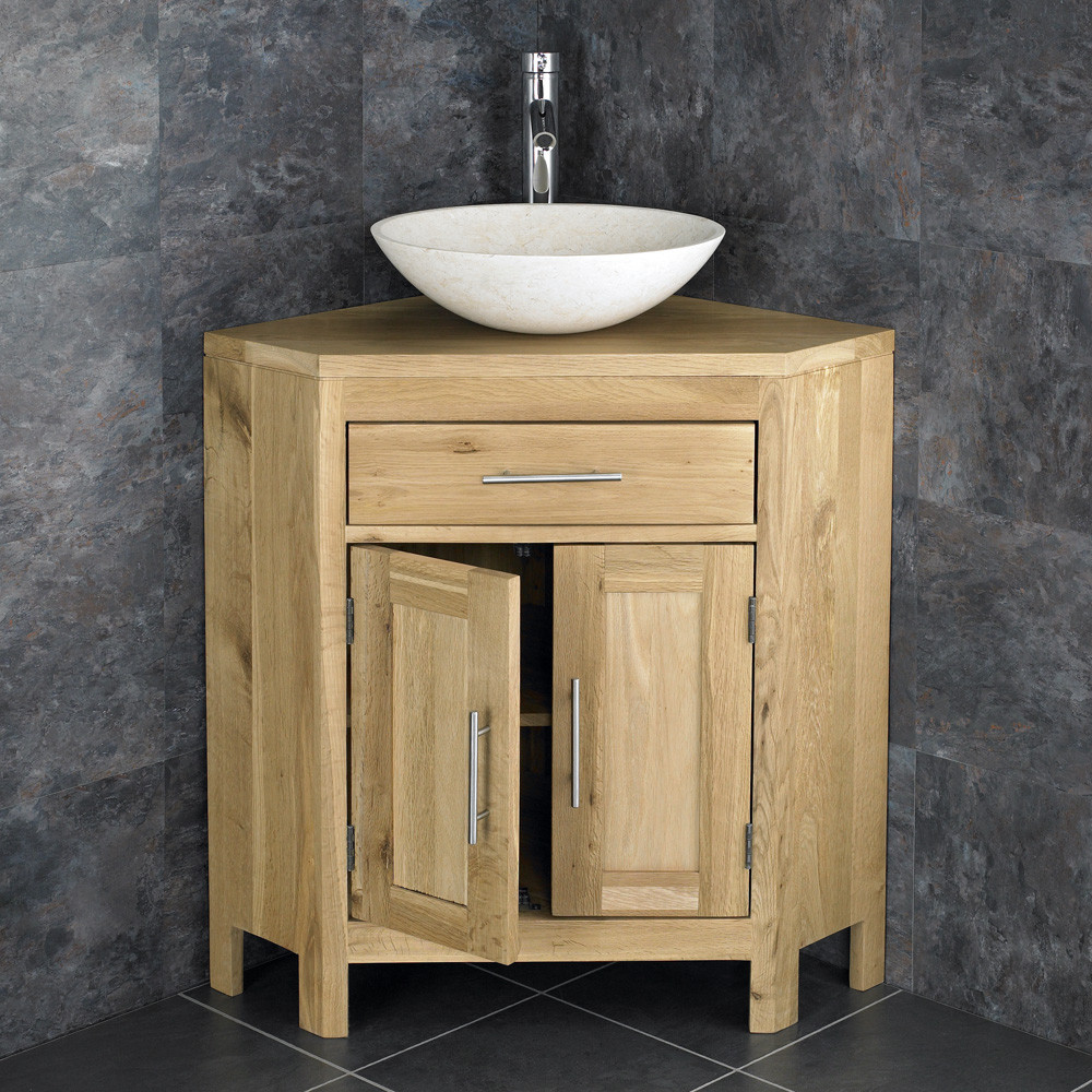 • A stylish natural oak corner vanity unit and elegant cream limestone freestanding circular basin set