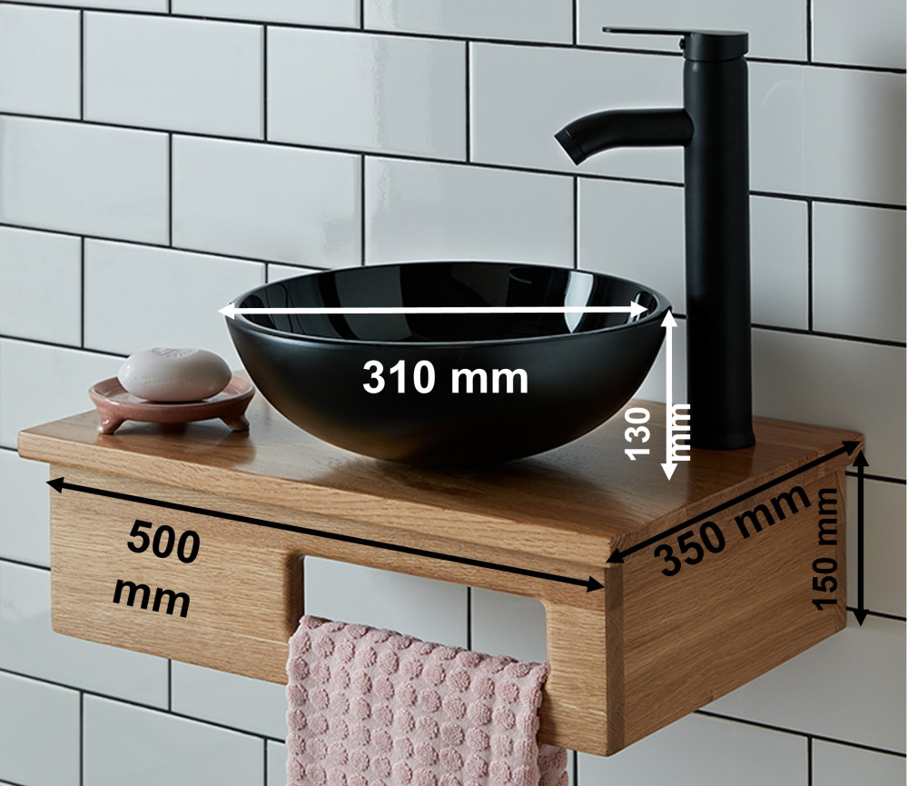 The charming, rustic-looking rectangular oak shelf provides much-needed storage space for toiletries. It also comes with a clever cut-out section for a towel, so you don't have to install a separate handrail. No tap or waste hole is pre-drilled, so you can install these wherever it works best for your bathroom.