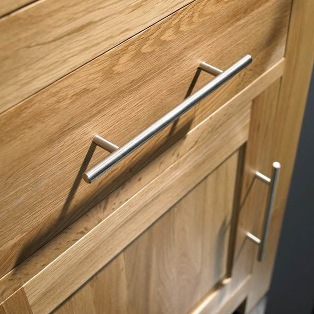 • pre-assembled cabinet with no flat pack components with natural solid oak finish