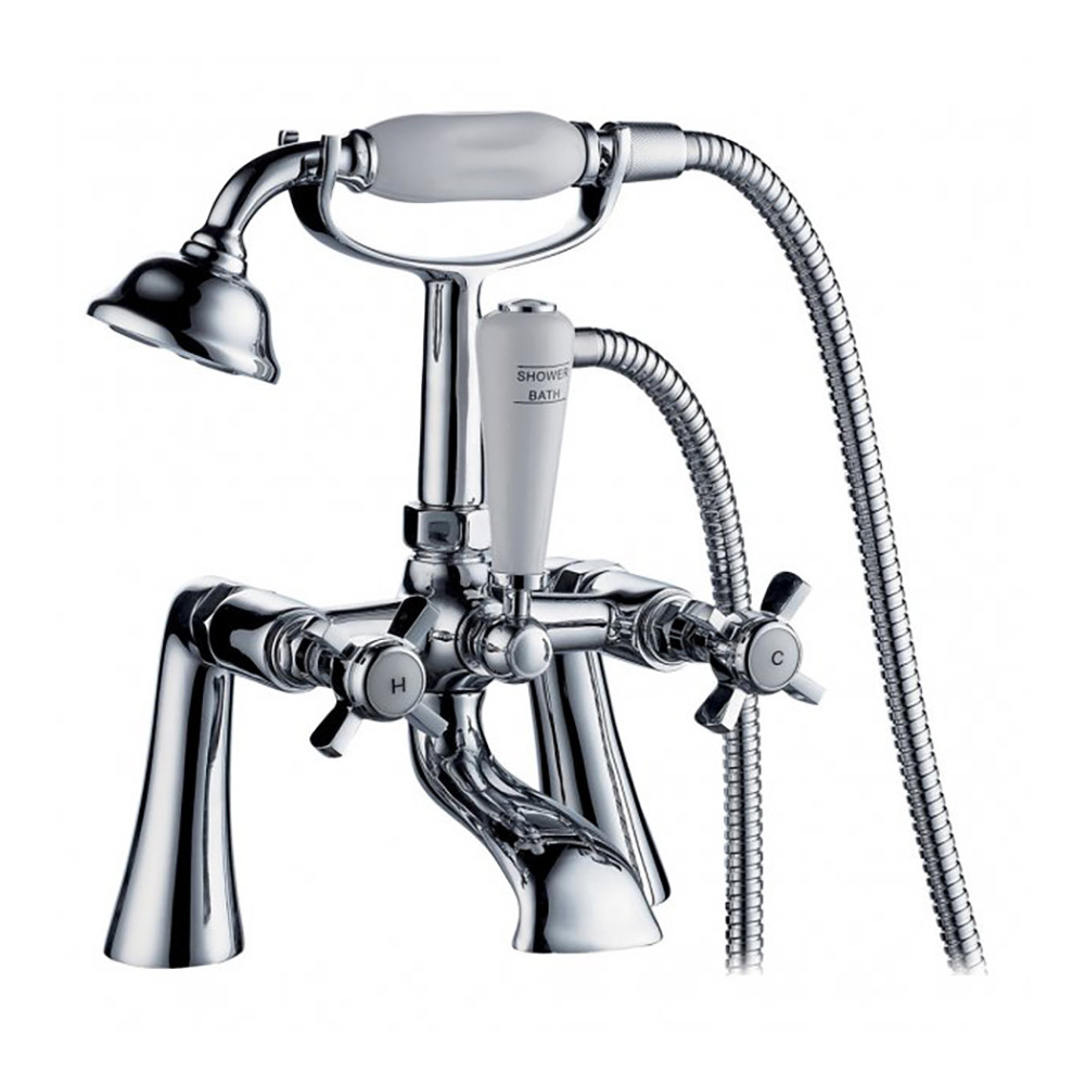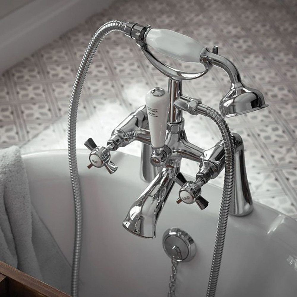• A vintage-styled deck-mounted chrome mixer tap with shower set