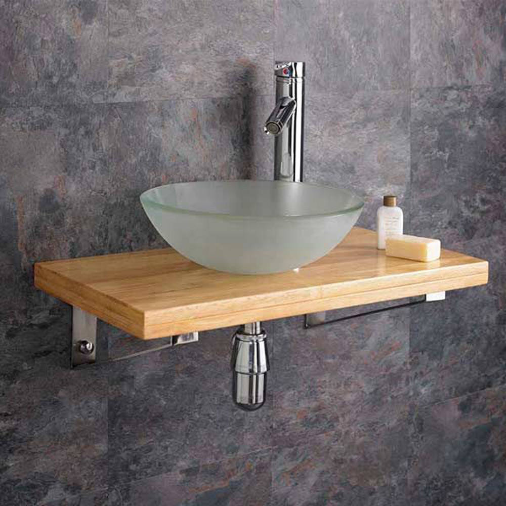 Features & Benefits: DISCON - Potenza 310mm Frosted Glass Round Bowl on Wall Hung Wooden Shelf Basin Set with Tap and Waste