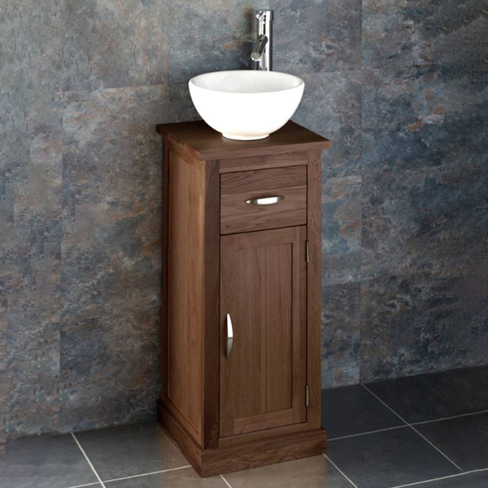 Features & Benefits: DISCON - Small Square Dark Oak Vanity Cabinet & White Ceramic Round Basin