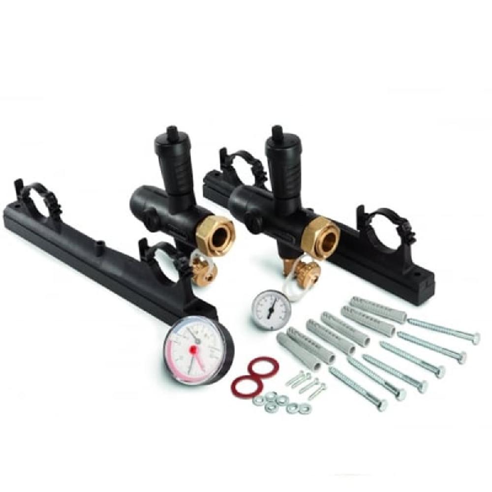 Each Starter Pack contains: two Combined Inlets with automatic air vents and 3/4" fill/drain ports, two End Caps, two Brackets and Spacers, one Combined Pressure and Return Temperature Gauge, one Flow Temperature Gauge, and one Installation Kit.
