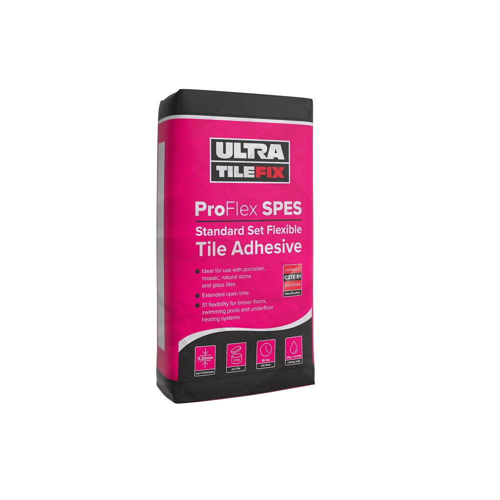 Suitable for use with a wide range of tile types, including porcelain, glass, natural stone, and mosaics, this adhesive offers exceptional versatility. It can be applied to multiple surfaces and substrates, from plasterboard and tile backer boards to anhydrite screeds and concrete. Backed by a lifetime guarantee, UltraTileFix ProFlex SPES ensures a strong, reliable, and lasting bond.
